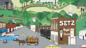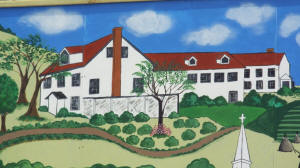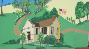 The 36 feet long by 8 feet tall mural, mounted on the side of the buildings owned by Peter and Andrea Niehaus, celebrates the history of the town with tributes to each of 22 landmarks within the community.