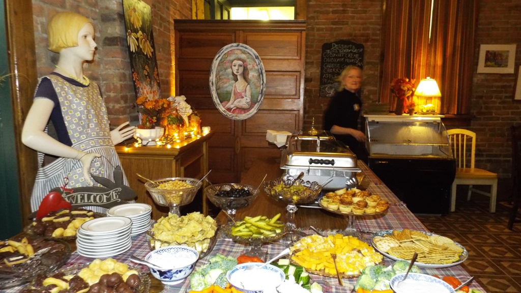 The Saturday afternoon event was an invitation only ceremony. When the ribbons had been removed, everyone present lined up in front of the mural for a commemorative photo, then were invited inside to the Wild Hare Café for refreshments and fellowship. A large buffet of finger foods was set out and a variety of wines were uncorked for the reception.
