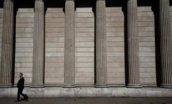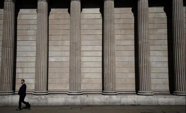 A pedestrian walks past the Bank of England in the City of London,