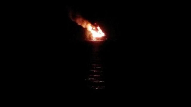 Flames are seen after an explosion at an oil rig in Lake