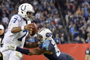 Colts quarterback Jacoby Brissett (7) is tackled by Tennessee Titans