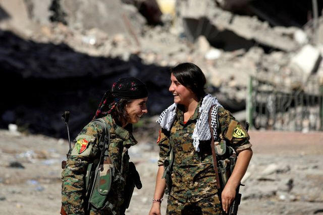 Female fighters from Syrian Democratic Forces (SDF) react in Raqqa,