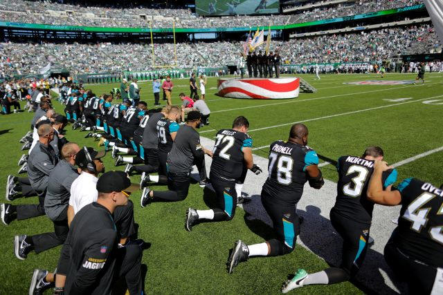 Jacksonville Jaguars players kneel before the national anthem before