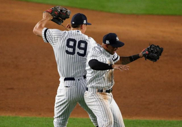 Judge (99) celebrate after defeating the Houston Astros in game four