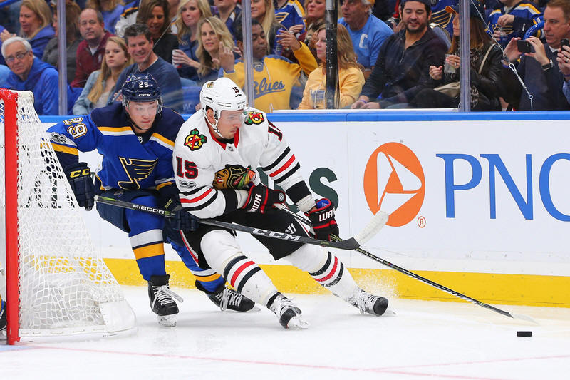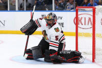 Blackhawks goalie Corey Crawford (50) makes a glove save during
