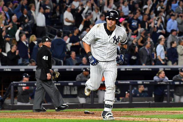 Yankees catcher Gary Sanchez (24) hits a home run during the
