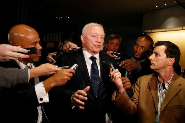 Dallas Cowboys owner Jerry Jones speaks to members of the media