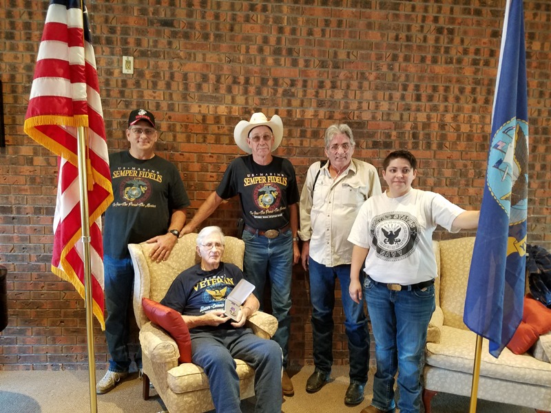 Hickey (seated) now has his Purple Heart holding it proudly, surrounded by his sons, (left to right) David, Gene and Gary. Holding the Navy flag is Hickey's great-granddaughter Tiffany Mass. Tiffany is also a Navy Veteran.