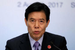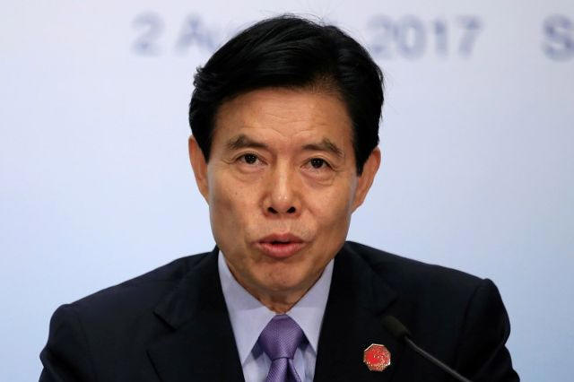 China's Commerce Minister Zhong Shan attends a news conference of BRICS (Brazil, Russia, India, China and South Africa) trade ministers meeting in Shanghai, China August 2, 2017. REUTERS/Aly Song
