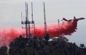An air tanker drops fire retardant while battling the Wilson Fire