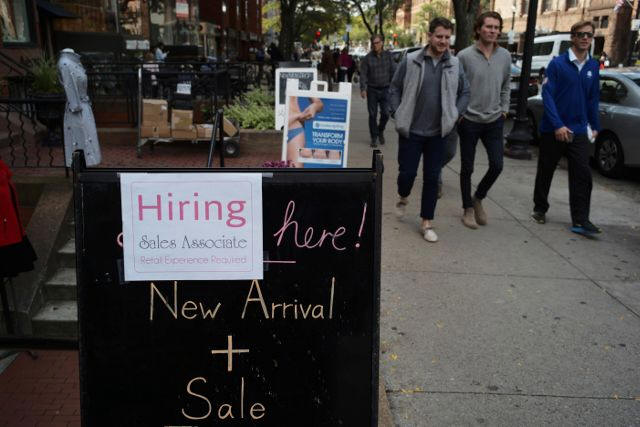 Pedestrians pass a sign advertising a sale and a job opening at a