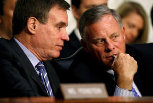 and ranking member Mark Warner (D-VA) talk during a hearing about
