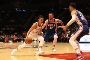 Jeremy Lin (7) dribbles the ball as Philadelphia 76ers guard JJ