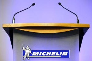 The logo of French tyre maker Michelin is seen on an empty podium in