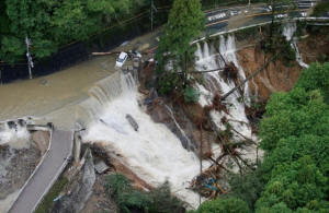 A collapsed road is seen following torrential rain caused by typhoon