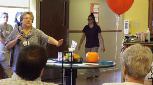 The group made up of on duty staff, plus many who had come in to work just for this exercise, began the day by hearing a brief orientation presented by Administrator Jo Hilliard.