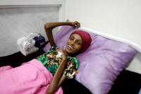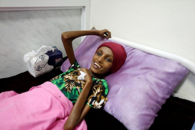 has been affected by severe malnutrition, rests on a bed at