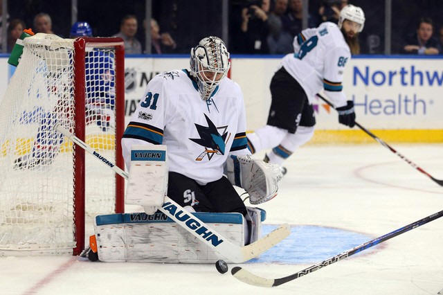 Sharks goalie Martin Jones (31) makes a save against the New York