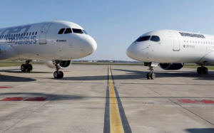 An Airbus A320neo aircraft and a Bombardier CSeries aircraft are