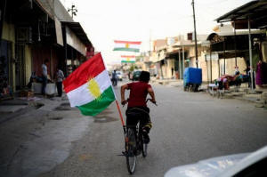 A boy rides a bicycle with the flag of Kurdistan in Tuz Khurmato,
