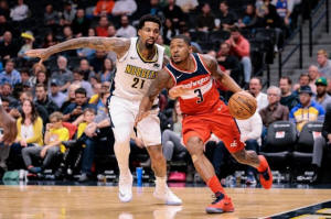 Nuggets forward Wilson Chandler (21) guards Washington Wizards guard