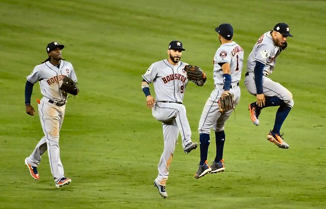 (9) , Carlos Correa (1) and George Springer (4) celebrate after