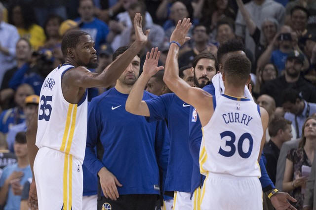Warriors forward Kevin Durant (35) high fives guard Stephen