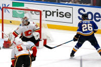Flames goalie Eddie Lack (31) is unable to block a shot by St.