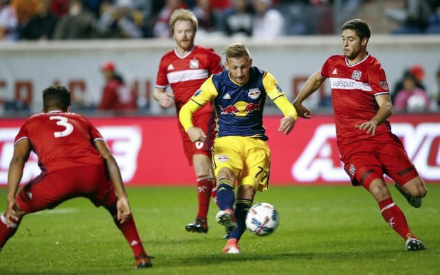 New York Red Bulls midfielder Daniel Royer (77) scores against