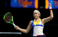Latvia's Jelena Ostapenko reacts during her group stage match