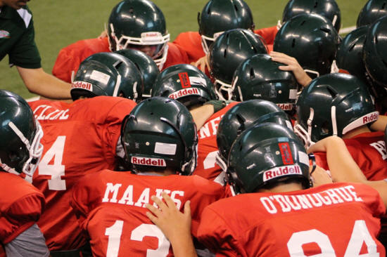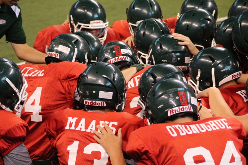 Pictured, members of the senior team huddle for a