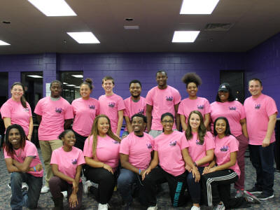 gathered early for a picture in pink and