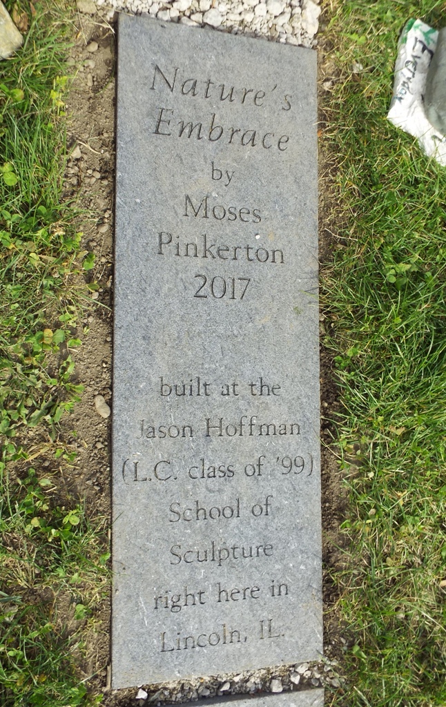 On Saturday, a large group came out for the dedication service, which included the unveiling of an engraved stone slab acknowledging the artists and their gift to the college. The stone, which lays at the feet of the statue reads, “Nature’s Embrace by Moses Pinkerton 2017 built at the Jason Hoffman (L.C. Class of ’99) School of Sculpture right here in Lincoln, IL.”