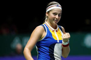 Latvia's Jelena Ostapenko celebrates winning her group stage match