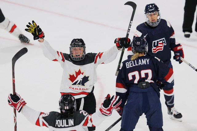 Canada forward Meghan Agosta (top L), Canada forward Marie-Philip