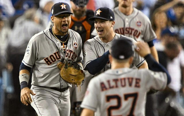 baseman Yuli Gurriel (10) and third baseman Alex Bregman (2) after