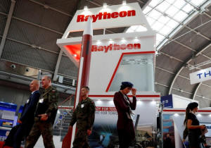 People pass the U.S. defense company Raytheon stand at an international military fair in Kielce, Poland September 7, 2017. REUTERS/Kacper Pempel/File Photo |