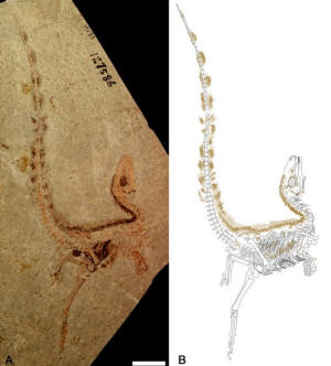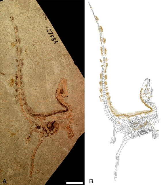 Sinosauropteryx measured about 3.5 feet (1 meter) long, was two-legged