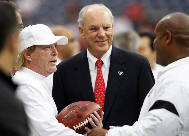 Houston Texans owner Bob McNair (C) as he is greeted on the field