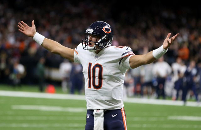 Bears quarterback Mitchell Trubisky (10) gestures during the second