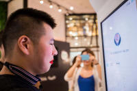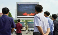 North Koreans watch a news report showing North Korea's