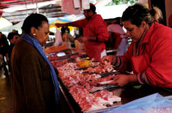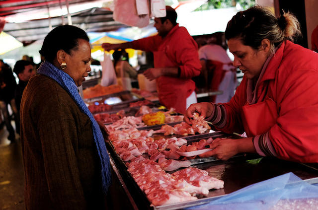 A vendor (R) sells chicken legs to a costumer at Feira Livre market in Sao Paulo, Brazil, August 18, 2017. REUTERS/Nacho Doce |