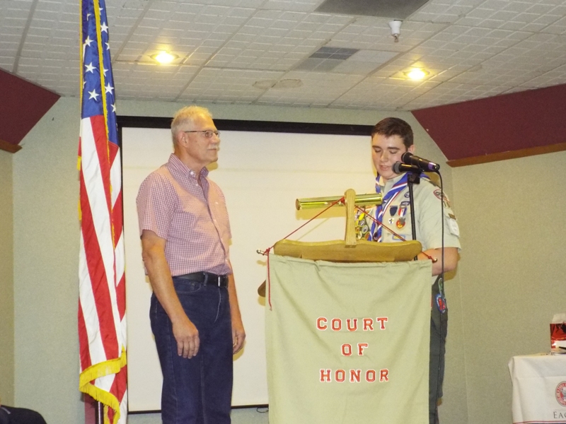 Stambaugh presented his second pin to Scoutmaster Robison. “Thank you Ed for always being there as well, from Monday night meetings to campouts, you were there. You are a good leader and we all look up to you even when you are playing Munchkins and back-stabbing us! You shared your scouting experiences like your Eagle Court Review to help and encouraged me in my review. I will never forget your presence.”