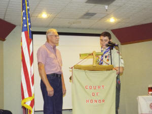 Craig then called forward his grandfather, Dennis Schilling. “Granddad, where do I begin? Let’s start back in my Cub Scout years. When dad was working second shift, you stepped right in to help with my pinewood derby, and attended camp with me. During those years it was fun to hear your scouting stories with your brothers. You taught me stamina and the will to complete a task as we completed the 20-mile Lincoln Trail together. Thanks for encouraging me and seeing me along in my scouting career. Learning your standards in life, such as family comes first, time management, willingness to serve others, and love of God and country, have helped to make me the man I am today. I look forward to spending more time with you and showing you that I will always respect the man and grandad you are.”