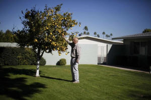 A senior picks some fruit off a tree in Sun City, Arizona, January