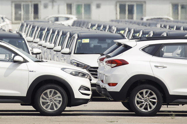 Cars made by Hyundai Motor Co are parked in the compound of the