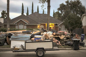 debris outside a house flooded by Tropical Storm Harvey in Houston,