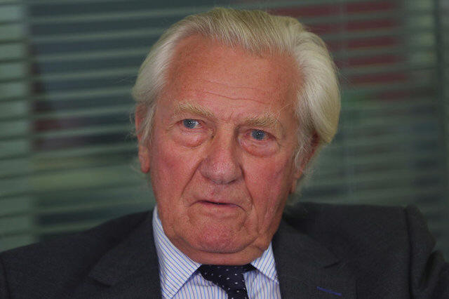 Former British Deputy Prime Minister Michael Heseltine speaks to a