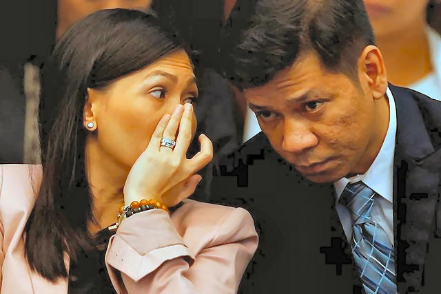 Banking Corp (RCBC) whispers to her lawyer as she testifies during a