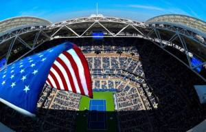 A general view of the American flag over Ashe Stadium while Karolina